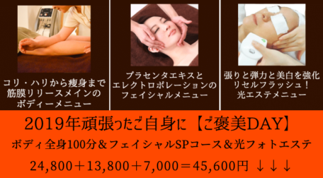 いよいよ元町にもイルミネーションが点灯しました。 冬の訪れの合図です! 11月からは、イベントや忘年会等も増えることでしょう。 忙しい中にもご自身を労って1Day美活デーを満喫しませんか? 名付けて【プリンセスコース】で … 続きを読む 2019年も頑張った貴女へ1Day美活クーポン